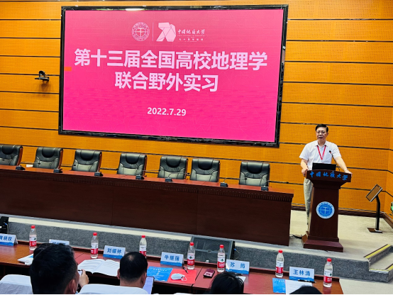 (武汉)党委书记黄晓玫为开幕式致辞。她代表学校对来自36所兄弟院校参加全国地理学联合野外实习的师生表示热烈欢迎。她表示,野外实践教学是人才培养的重要环节,是了解我国地貌类型差异的重要途经。本次活动学校高度重视,经过多轮专家充分论证,确定江汉平原-鄂西山地实习路线作为今年全国地理学联合野外实习路线。全体师生将实地领会湖北省多样的地理环境、孕育的灿烂文明以及服务于国民经济和社会发展的重大工程。