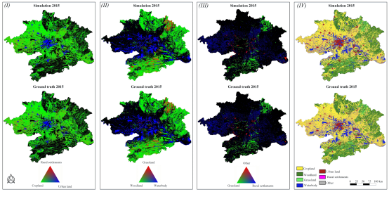 图3为2012年武汉城市圈土地利用结构变化模拟结果与真实结果的对比。混合元胞CA的模拟结果,采用亚像元混淆矩阵,相对熵和mcFoM三个指标来验证。 获得了较高的模拟精度,起中总体精度OA=0.9303,平均相对熵meanRE=0.9768,mcFoM = 0.2959。高于纯质元胞的OA=0.8967, FoM=0.1530。