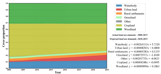 我们使用线性回归方法,根据2000年、2005年、2010年和2015年的历史土地利用数据来预测未来的土地利用需求。图6描绘了2015年至2035年7种土地利用类型的拟合方程和预测轨迹。
