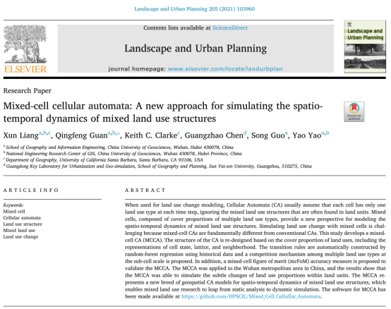 Liang X., Guan Q.*, Clarke KC, Chen G., Guo S., & Yao Y., 2020. Mixed-cell Cellular Automata: A new approach for simulating the spatio-temporal dynamics of mixed land use structures. Landscape and Urban Planning, DOI: //doi.org/10.1016/j.landurbplan.2020.103960. (IF: 5.441,地理学和城市研究1区, Top期刊)