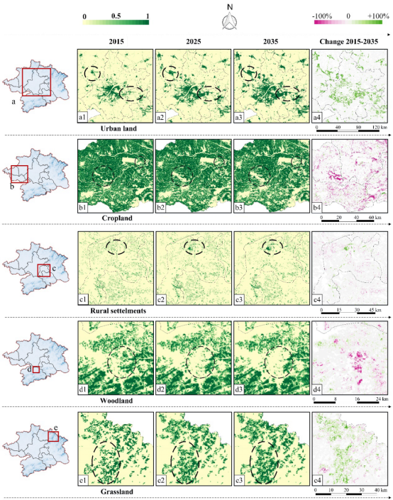 图6 模拟研究区未来土地利用变化的分布 (2015-2035年)。
