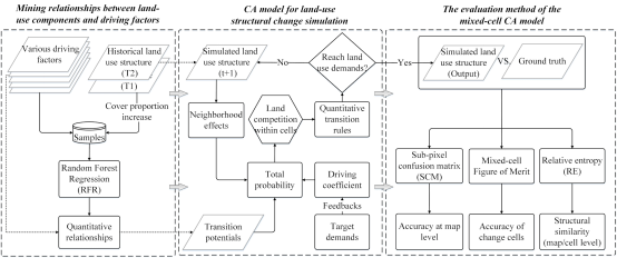 传统元胞自动机(CA)模型通常假设每个元胞在每个时刻都只包含一种土地利用类型,因此传统CA模型忽略了元胞内部的混合土地利用结构。我们的最新研究提出了一种基于混合元胞的CA模型(Mixed-cell Cellular Automata, MCCA),该模型的元胞内部含有各类用地的覆盖比例,即元胞内部包含土地利用结构,为混合土地利用结构的时空动态建模提供了新的视角。与传统的CA模型相比,混合元胞CA模型在元胞自动机的四个基本要素方面都有所不同,包括元胞状态,元胞空间、元胞邻域和转化规则。本文所提的MCCA模型利用回归算法,基于两期土地利用之间的变化自动构建元胞自动机的转化规则;并提出了模拟亚元胞尺度上多种土地利用类型之间相互竞争的机制,该机制可以用于定量地模拟像元内部土地利用结构的变化。此外,本文还提出了混合元胞CA模型的验证指标mcFoM。我们将MCCA模型应用于武汉“1+8”城市圈的土地利用结构变化模拟当中,实验结果表明,MCCA能够模拟土地单位内土地利用比例的精细及时空连续的变化。 MCCA模型的提出是地理元胞自动机应用的新的尝试和理论的重要补充,推进了混合土地利用研究从静态制图到动态模拟的发展。