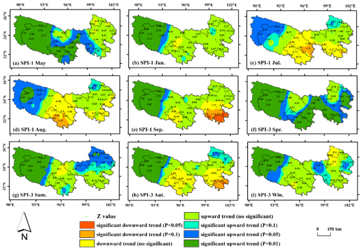 图4. 使用Mann-Kendall(MK)趋势检验方法研究SPI的月度、季节趋势变化