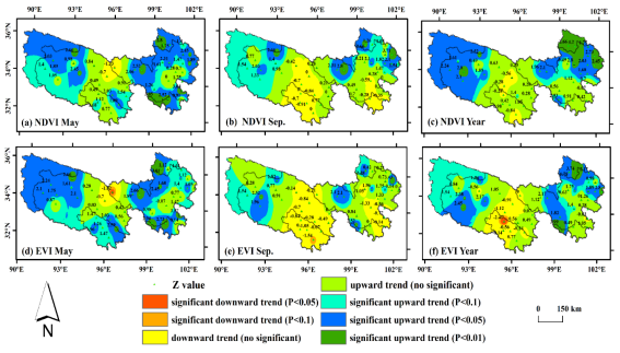 图6. 使用MK趋势检验方法,研究2000-2018年期间的NDVI、EVI的月度和年际趋势。