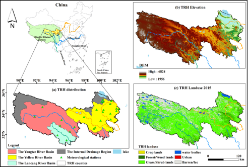 图1. 三江源地理位置,DEM和2015年土地使用类型的位置。