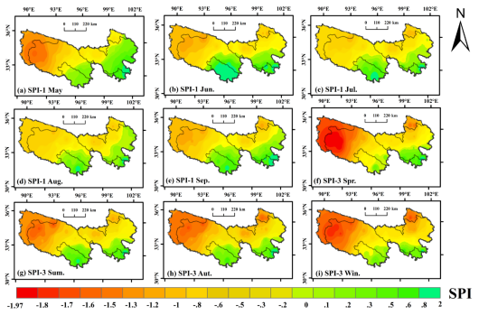 图3. 三江源区SPI的空间分布。(a-i)分别表示5月,6月,7月,8月,9月,春季,夏季,秋季和冬季。
