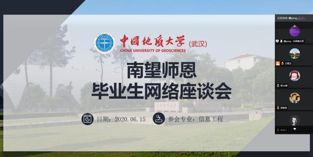 (通讯员:王煜杰)2020年6月15日星期一上午10:00-11:00,信工专业116161班与116162班共同在线上组织召开了“南望师恩毕业生网络座谈会”,本次会议由116161班班长杨鑫主持,邀请了武伊娴,鲍嘉豪,王善霖,郭雲翔四位优秀毕业生,以及黄鹰,万林,陈占龙三位老师进行发言。